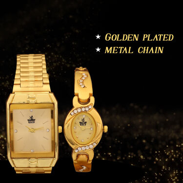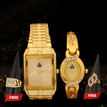 Elevate your style with our Couple Watch set, complete with free Couple Rings. These stunning golden watches feature water-resistant stainless steel straps and designer metal straps for a touch of elegance. With analog display and quartz mechanism, they're perfect for casual, party, or formal occasions. The stainless steel case ensures durability, while the slide clasp offers a secure fit. Each set includes a men's and women's watch along with matching golden rings, making it an ideal gift for couples. Enjoy the timeless charm and reliability of these exquisite timepieces